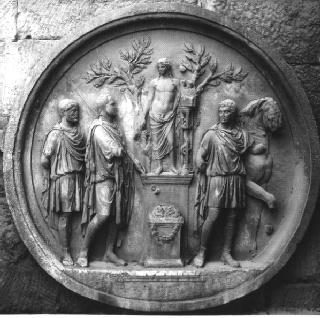Konstantinsbogen eingebaut. Zu Zeiten des Kaisers Hadrian wurde der Apollokult neu belebt. Man feierte den Gott als das Sinnbild für männliche Schönheit im Gleichklang mit Venus. Aus dieser Zeit stammen auch die besten Kopien antiker Statuen. Im spätantiken Rom traten manche Kaiser auch als Abbild des vereinigten Apollo-Sol auf und wurden mit einem Nimbus dargestellt. |